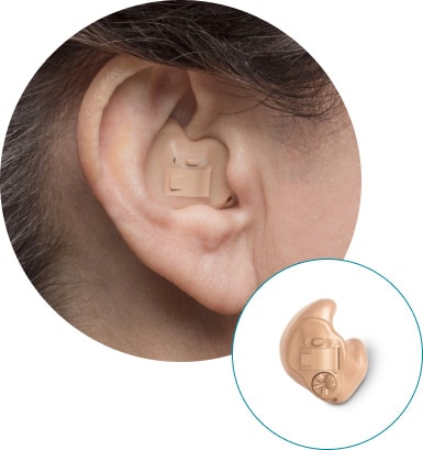 This hearing aid is placed in the ear canal and is the smallest available. It takes advantage of the ear’s natural ability to collect sound, and its discreet size makes the device virtually invisible to others.